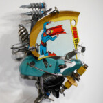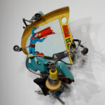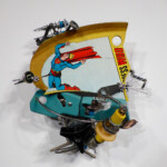In this series I have collaged comic book images of a rogue Superman into wall-hung three-dimensional cartoons composed of typewriter pieces, plastics, and other found objects, mechanically connected with nuts and bolts as well as springs. These machine-like constructions illustrate the dysfunctional, illogical machinery already evident in the nascent Trump administration. They also foreshadow the likely disasters ahead resulting from the executive branch of the American government headed by a mentally ill man.